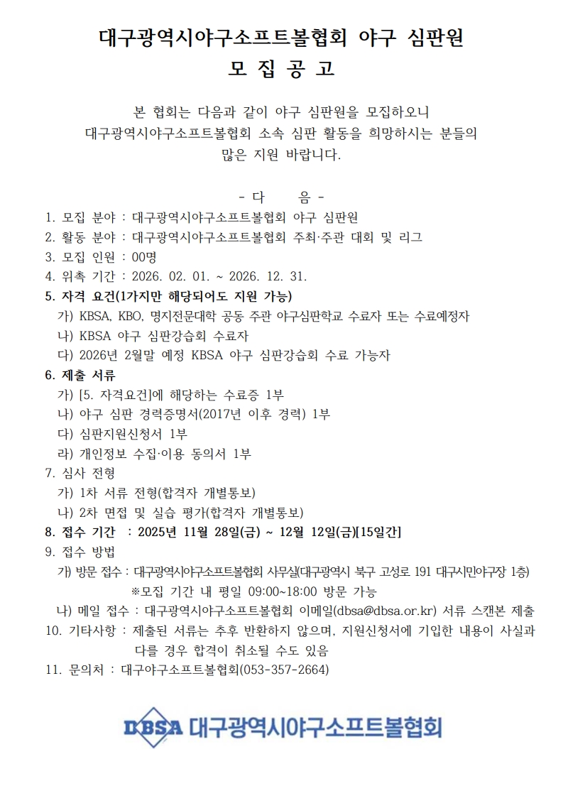 대구광역시야구소프트볼협회 심판원 모집공고