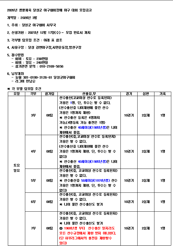 2026년 생활체육 달성군 야구협회장배 야구 대회 모집공고